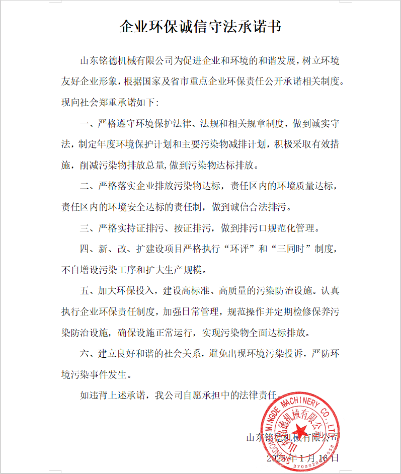 山東銘德機(jī)械有限公司為促進(jìn)企業(yè)和環(huán)境的和諧發(fā)展,樹立環(huán)境友好企業(yè)形象,根據(jù)國(guó)家及省市重點(diǎn)企業(yè)環(huán)保責(zé)任公開承諾相關(guān)制度?,F(xiàn)向社會(huì)鄭重承諾如下: